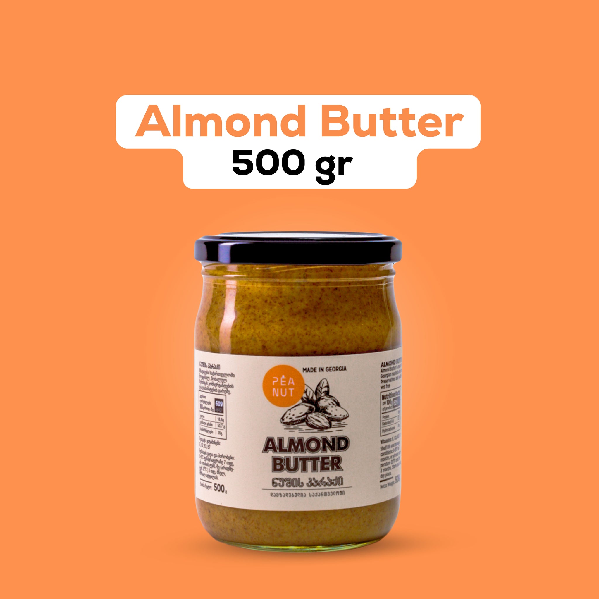 Pure almonds, thick texture and honest taste. Made with 100% Georgian roasted almonds — nothing else inside. You'll only feel the crunchy texture and the real almond flavor — with every spoonful.