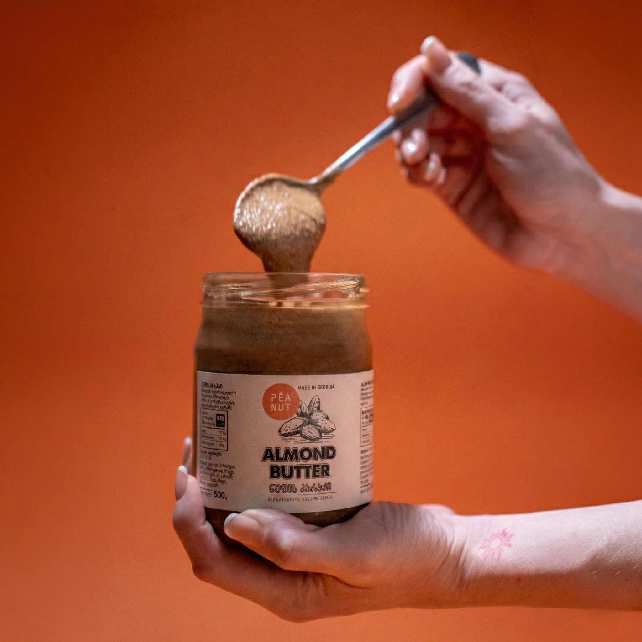 ნუშის კარაქი: სქელი ტექსტურით და სუფთა გემოთი. გაჯერებულია E ვიტამინითა და ჯანსაღი ცხიმებით.